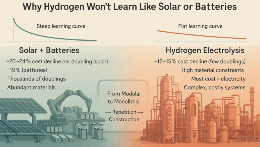 Despite persistent claims that hydrogen is on a similar cost-reduction trajectory as solar panels and batteries, a detailed analysis reveals fundamental economic and technical barriers preventing such a trend. The total cost of hydrogen is dominated by the price of electricity, which accounts for up to 70% of the final figure. Unlike the simple, mass-produced nature of solar modules, hydrogen electrolyzers are complex, customized systems with significantly lower potential for cost reduction through manufacturing scale, ensuring hydrogen will likely remain a high-cost, niche solution for decarbonization.