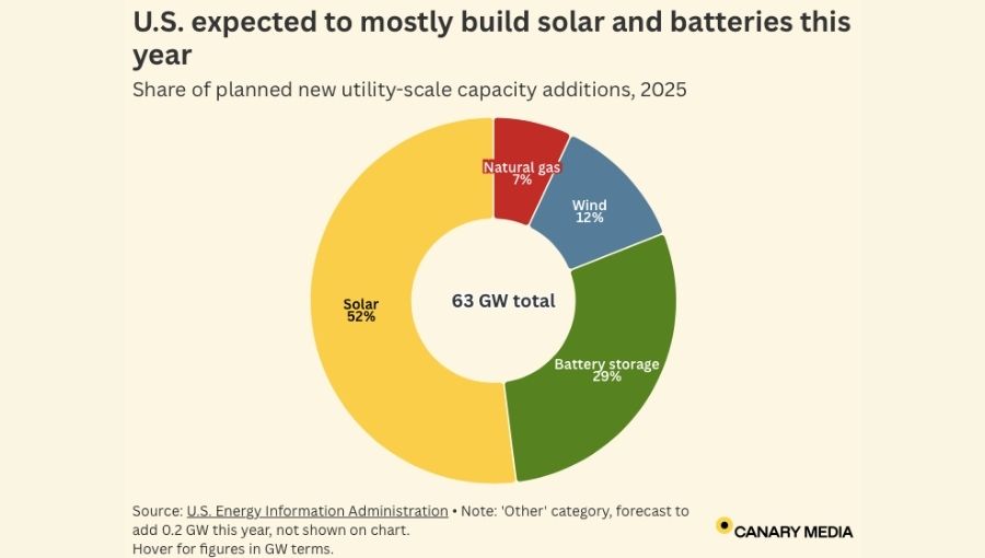 According to the U.S. Energy Information Administration (EIA), the country is set to add a record 63 GW of new power plant capacity in 2025—93% of which will come from carbon-free sources. This surge in clean energy comes amid growing electricity demand driven by AI data centers and domestic manufacturing.