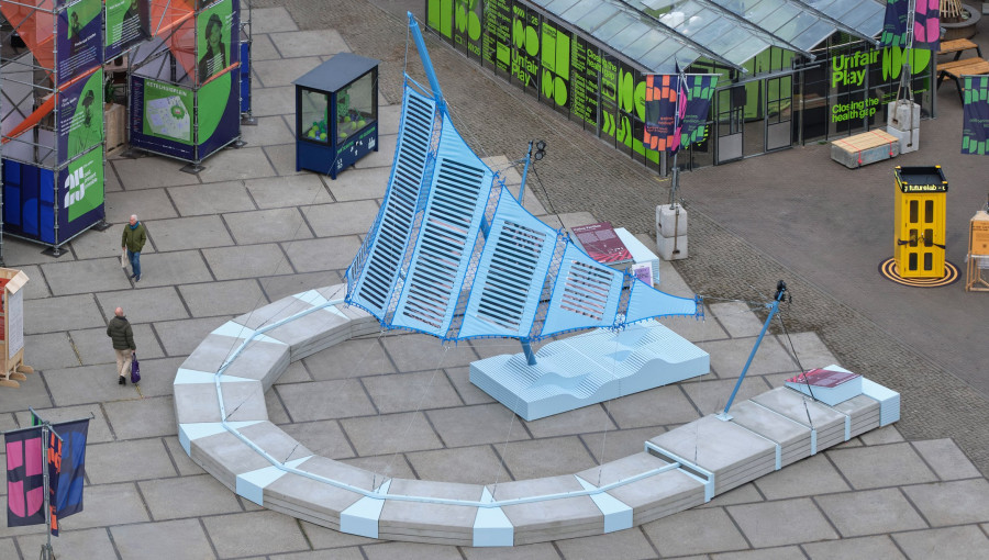 Fashion designer Pauline van Dongen has unveiled a unique pavilion at the Dutch Design Week in Eindhoven, showcasing her innovative textile known as Heliotex. This eye-catching canopy, designed to resemble a kite, incorporates solar technology through a lightweight, flexible material that generates solar energy. The Umbra Pavilion, located in the Strijp-S district, features a distinctive blue structure crafted from recycled polyester intertwined with organic photovoltaic solar cells.