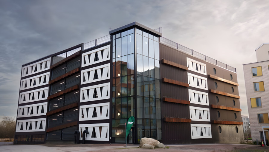 The five-story structure provides 365 parking spaces and is equipped with modern sustainable features, including 40 charging points for electric vehicles and an on-site battery for energy storage. To complement the industrial aesthetic of the blades, the facade also incorporates planters with local greenery, which will grow over time to soften the building’s appearance. Architect Jonas Lloyd hopes the project serves as an “eye-opener,” inspiring developers and designers to think differently about construction materials and what can be achieved with industrial waste.